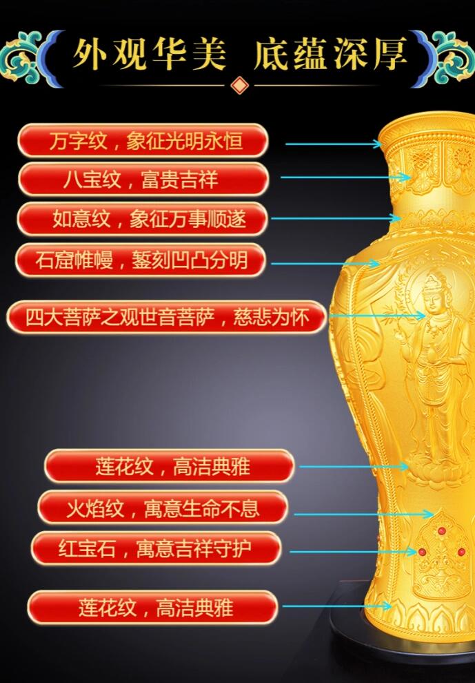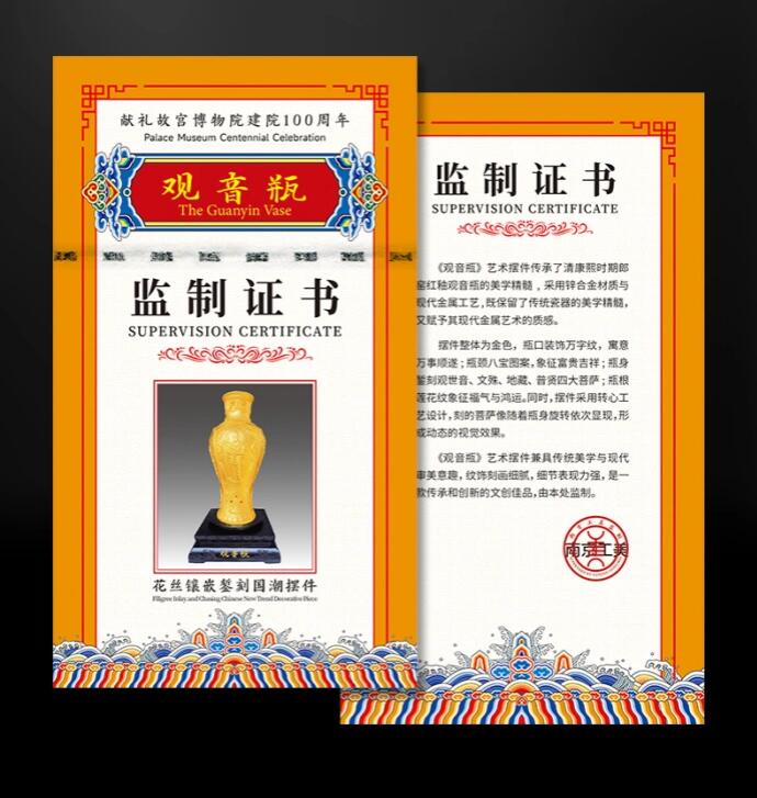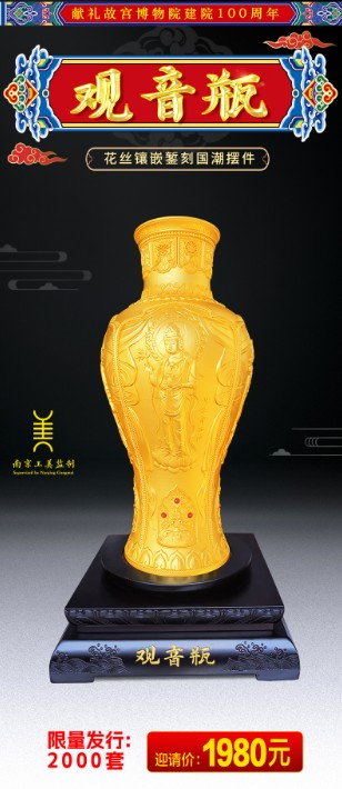 《觀音瓶》花絲鑲嵌鏨刻國潮擺件以珍藏在珍藏在故宮博物院的國寶文物為原型,響應(yīng)國家文化復(fù)興理念、文化強(qiáng)國戰(zhàn)略,傳承使用非遺古法技藝花絲鑲嵌和金屬蒸刻,將中國古代傳統(tǒng)文化與當(dāng)今國際工藝進(jìn)行融合。