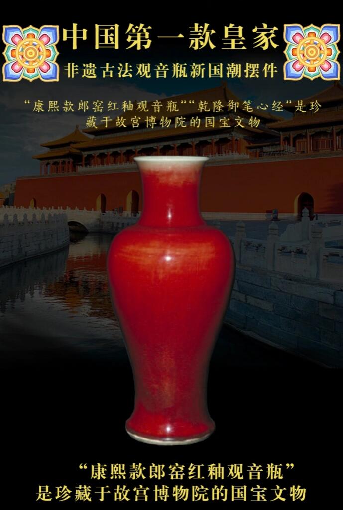“康熙款郎窯紅釉觀音瓶”是珍藏于故宮博物院的國寶文物觀音瓶,因器型與傳統(tǒng)文化中觀世音菩薩手中玉凈瓶相似而得名。又因觀音與官印諧音、瓶與平諧音,有官運(yùn)亨通、平安順?biāo)斓募樵⒁?