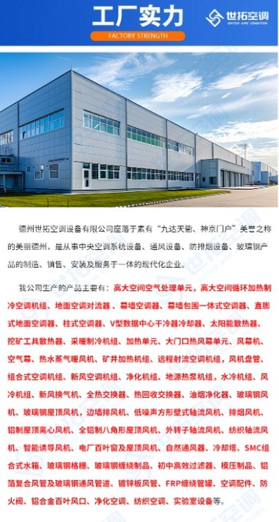 德州世拓空調(diào)設備有限公司,公司占地面積500畝,員工400人。本公司始終奉行以“質量求生存、以信譽求發(fā)展”的企業(yè)宗旨,經(jīng)合肥機械研究院檢驗,各項指標均達到或超過國家標準,公司大量引進數(shù)控自動化生產(chǎn)設備,成功推出中央空調(diào)末端系列。中央空調(diào)主機(空氣源熱泵、地源熱泵、水源熱泵、風冷模塊機組)螺桿式水、地源熱泵機組、渦旋式水、地源熱泵機組、滿液式水、地源熱泵、箱體式水、地源熱泵、風冷螺桿機組、水冷螺桿機組、水冷冷水機組、膨脹機、恒溫恒濕機組、食用菌機組、空氣源熱泵熱水機、風機盤管、新風換氣機、空調(diào)機組、風幕機、暖風機等末端設備配件