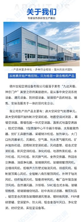 德州世拓空調(diào)設(shè)備有限公司,公司占地面積500畝,員工400人。本公司始終奉行以“質(zhì)量求生存、以信譽(yù)求發(fā)展”的企業(yè)宗旨,經(jīng)合肥機(jī)械研究院檢驗(yàn),各項(xiàng)指標(biāo)均達(dá)到或超過國(guó)家標(biāo)準(zhǔn),公司大量引進(jìn)數(shù)控自動(dòng)化生產(chǎn)設(shè)備,成功推出中央空調(diào)末端系列。中央空調(diào)主機(jī)(空氣源熱泵、地源熱泵、水源熱泵、風(fēng)冷模塊機(jī)組)螺桿式水、地源熱泵機(jī)組、渦旋式水、地源熱泵機(jī)組、滿液式水、地源熱泵、箱體式水、地源熱泵、風(fēng)冷螺桿機(jī)組、水冷螺桿機(jī)組、水冷冷水機(jī)組、膨脹機(jī)、恒溫恒濕機(jī)組、食用菌機(jī)組、空氣源熱泵熱水機(jī)、風(fēng)機(jī)盤管、新風(fēng)換氣機(jī)、空調(diào)機(jī)組、風(fēng)幕機(jī)、暖風(fēng)機(jī)等末端設(shè)備配件