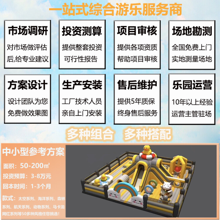 想要經(jīng)營(yíng)好一個(gè)持續(xù)盈利的充氣城堡樂(lè)園,需要具有全局的樂(lè)園運(yùn)營(yíng)思維,從后端運(yùn)營(yíng)推動(dòng)前端的設(shè)計(jì),打造差異化和個(gè)性化,在價(jià)格合理的范圍內(nèi),相差不遠(yuǎn)的情況下,建議選擇具有運(yùn)營(yíng)思維的一站式綜合游樂(lè)服務(wù)商,這樣不僅能夠得到高安全的設(shè)施,還能為樂(lè)園的提供保障。在前期就要對(duì)市場(chǎng)進(jìn)行調(diào)研分析,然后做適合自己的投資產(chǎn)出比方案,廠家還需進(jìn)行駐場(chǎng)運(yùn)營(yíng),的事情讓的人來(lái)做來(lái)指導(dǎo),成功率更大。
