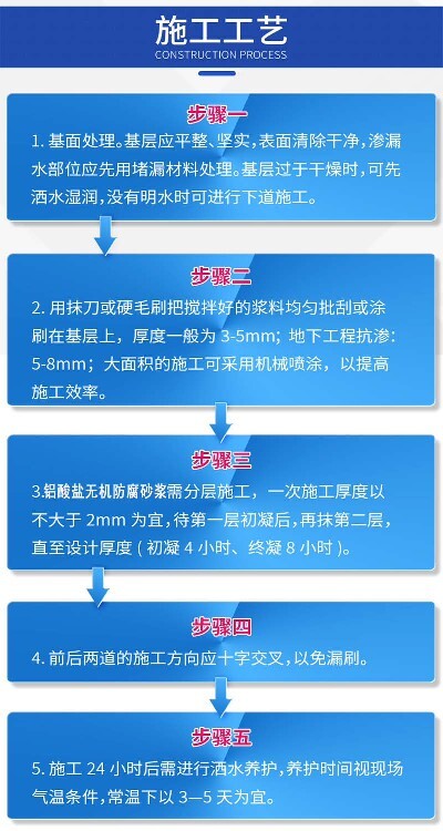 中德新亞鋁酸鹽無機(jī)防腐砂漿是一種由硅灰、鋁酸鹽水泥、鋁酸鹽、氯化鈣、外加劑等材料按一定比例混合而成的特種砂漿。它具有耐腐蝕、耐磨損、耐高溫等特點(diǎn),可以用于地下室、隧道、礦井、人防工程、地下人行道、地下商場(chǎng)、地下停車場(chǎng)、游泳場(chǎng)、水塔、給排水池、水泵站等有防水抗?jié)B要求的混凝土工程