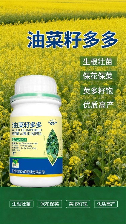 ?;ū9忻钫小J準油菜專用肥:花期管理直接影響油菜結(jié)實率。為峰肥業(yè)出品的油菜高產(chǎn)液肥——油菜籽多多,特別添加活性硼等?;ǔ煞?,有助于提高授粉質(zhì)量,減少落花落莢,為增產(chǎn)保駕護航。誠招區(qū)域代理,攜手開拓市場。