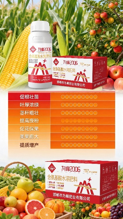 為峰2006含氨基酸水溶肥料集促長、抗逆、提質(zhì)、增產(chǎn)于一體,以合理的投入帶來顯著的產(chǎn)量與品質(zhì)回報(bào),是幫助農(nóng)戶實(shí)現(xiàn)增產(chǎn)增收的優(yōu)選產(chǎn)品。為峰肥業(yè)口碑載道?,F(xiàn)招商政策優(yōu)惠,歡迎咨詢加盟,搶占市場先機(jī)。