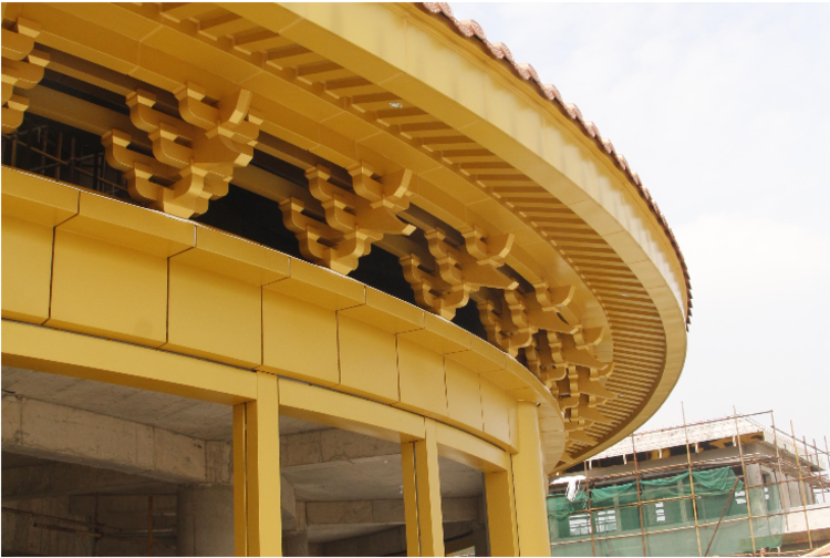 我國(guó)古建筑屋頂樣式豐富,變化多端,但總離不開(kāi)幾種基本的樣式,我們把這幾種基本的頂叫做“基本頂”,包括:硬山式、懸山式、歇山式、卷棚式、攢尖式、廡殿式等,項(xiàng)目:復(fù)古屋檐鋁合金斗拱,又作斗栱,是中國(guó)古建筑結(jié)構(gòu)的關(guān)鍵性部件,在橫梁和立柱之間挑出以承重,將屋檐的荷載經(jīng)斗拱傳遞到立柱。斗拱又有一定的裝飾作用,是中國(guó)古典建筑顯著的特征之一, 鋁單板做仿古建筑材料,古典與現(xiàn)代的碰撞, 添加幾分時(shí)代的氣息, 飛檐,是中國(guó)古代建筑在檐部上的一種特殊處理和創(chuàng)造,常用在亭、臺(tái)、樓、閣、宮殿、廟宇的屋頂轉(zhuǎn)角處,飛檐是其屋檐上翹,形如飛鳥(niǎo)展翅,輕盈活潑,是中國(guó)建筑上民族風(fēng)格的重要表現(xiàn)之一,我國(guó)傳統(tǒng)建筑檐部形式——屋檐特別是屋角的檐部向上翹起。 飛檐設(shè)計(jì)構(gòu)圖巧妙,造型優(yōu)美的屋頂給人們以賞心悅目的藝術(shù)享受。