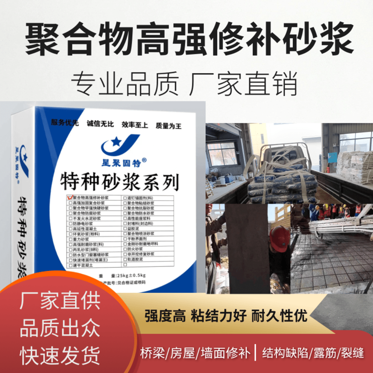 聚合物高強加固修補砂漿是一種新型材料,具有良好的施工和易性,現(xiàn)場加水攪拌即可使用,無需振搗,方便快捷。