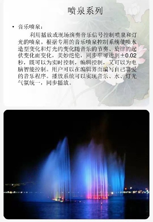 | 公司主營:音樂噴泉設(shè)備,噴泉設(shè)計施工維修,噴泉設(shè)備生產(chǎn)銷售安裝,旱地噴泉施工--> |